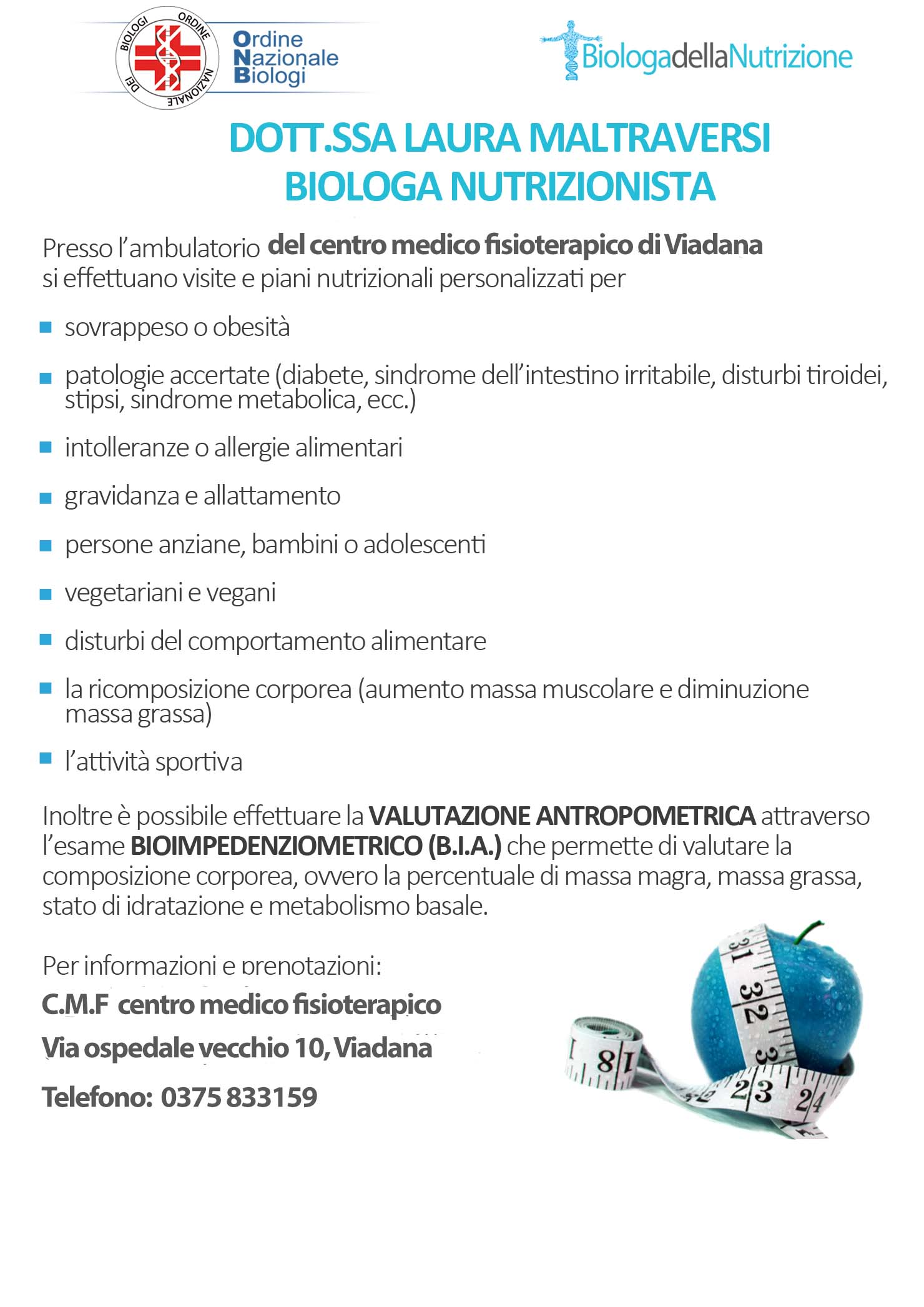 Dal mese di Febbraio le visite nutrizionali e l’esame bioimpedenziometrico verranno effettuati (nel solo giorno di MERCOLEDI POMERIGGIO) anche presso l’ambulatorio del centro medico Fisioterapico di Viadana, previo appuntamento telefonico. Nei restanti giorni della settimana i servizi sono disponibili nella sede di Casalmaggiore.