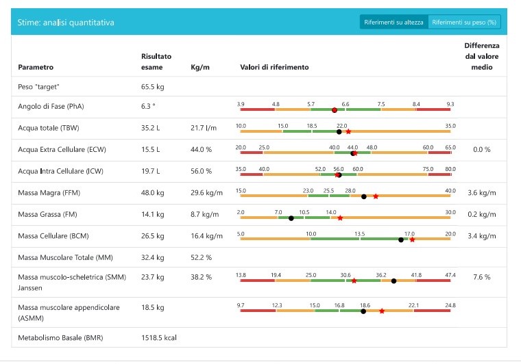 Di seguito possiamo vedere, dall’esame Bioimpedenziometrico o B.I.A., un dimagrimento, avvenuto nel tempo, nella maniera corretta. A fronte di una perdita di quasi 22 kg, la perdita di massa muscolare è stata minima (il soggetto era sedentario), con una perdita quasi esclusivametne di massa grassa.